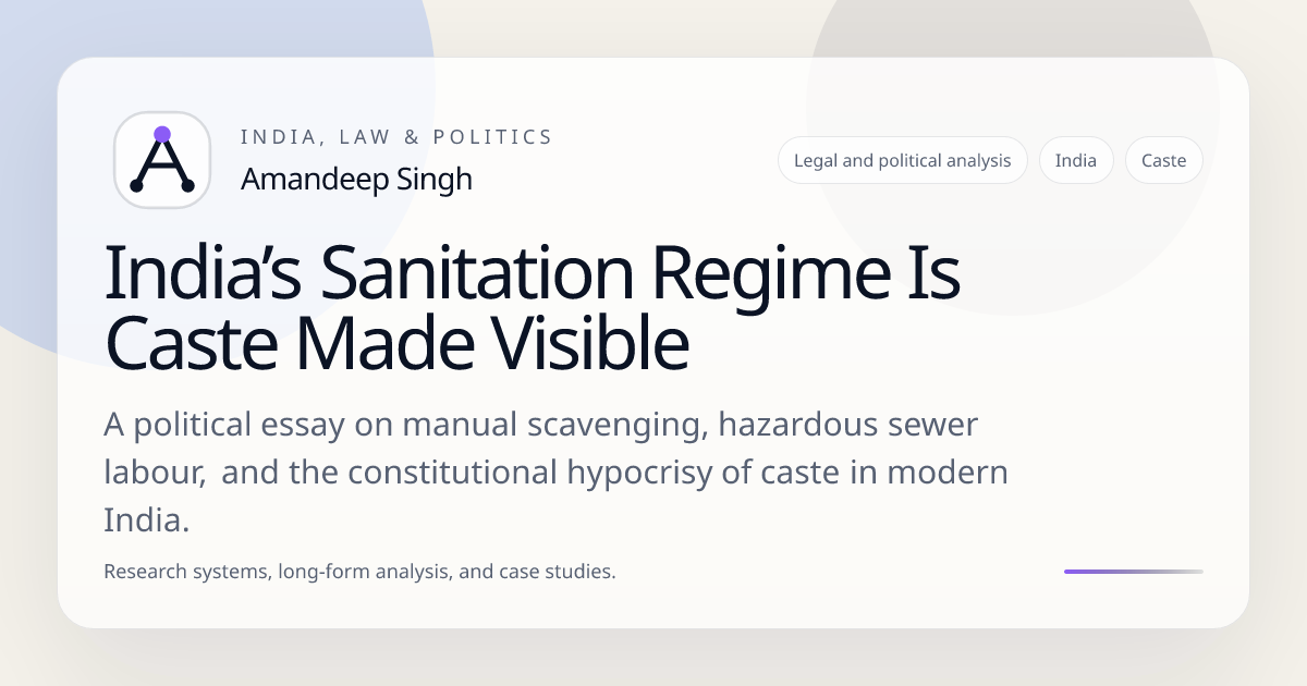 India’s sanitation regime is not an unfortunate accident at the edge of an otherwise modern republic. It is one of the clearest places where caste remains materially alive. The persistence of manual scavenging and hazardous sewer and septic-tank cleaning shows that India has not abolished the social logic of untouchability. It has bureaucratized it, renamed it, outsourced it, and occasionally condemned it in court. But it has not abolished it.